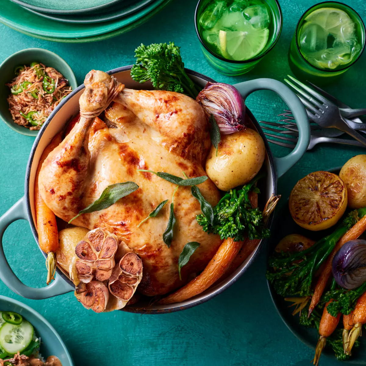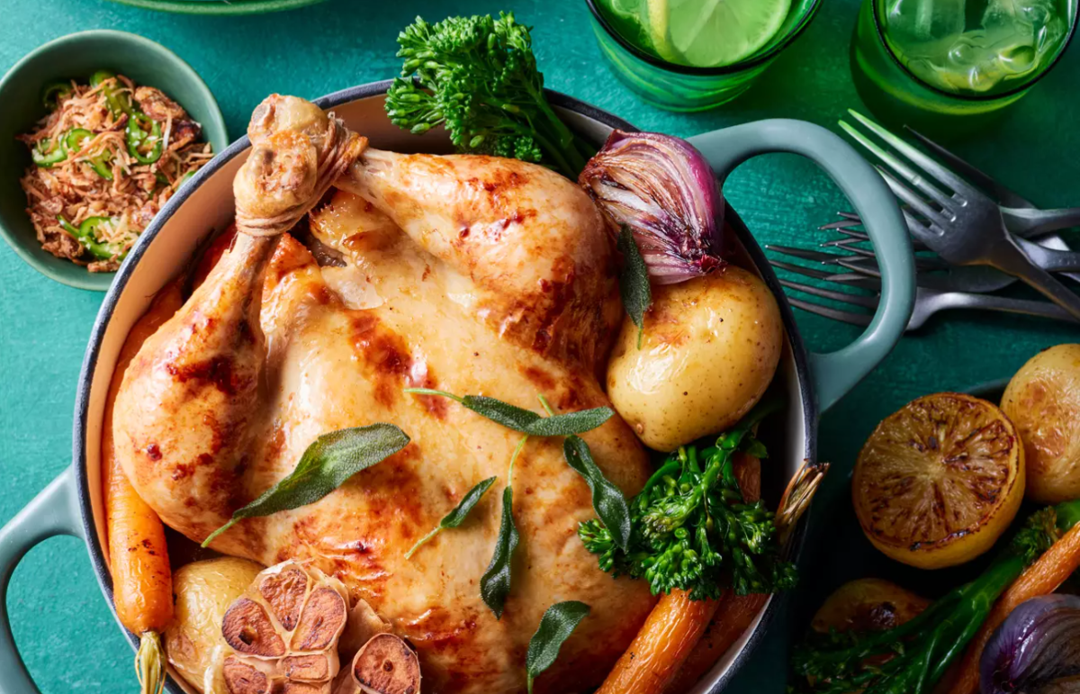 Return all vegetables to pan. Place chicken on top of vegetables. Spray chicken with oil. Roast for 1 hour and 15 minutes, checking occasionally to see if chicken is overbrowning. Spray broccolini with oil and add to pan. Roast for a further 5 minutes or until chicken is cooked and golden-brown. Remove from oven.